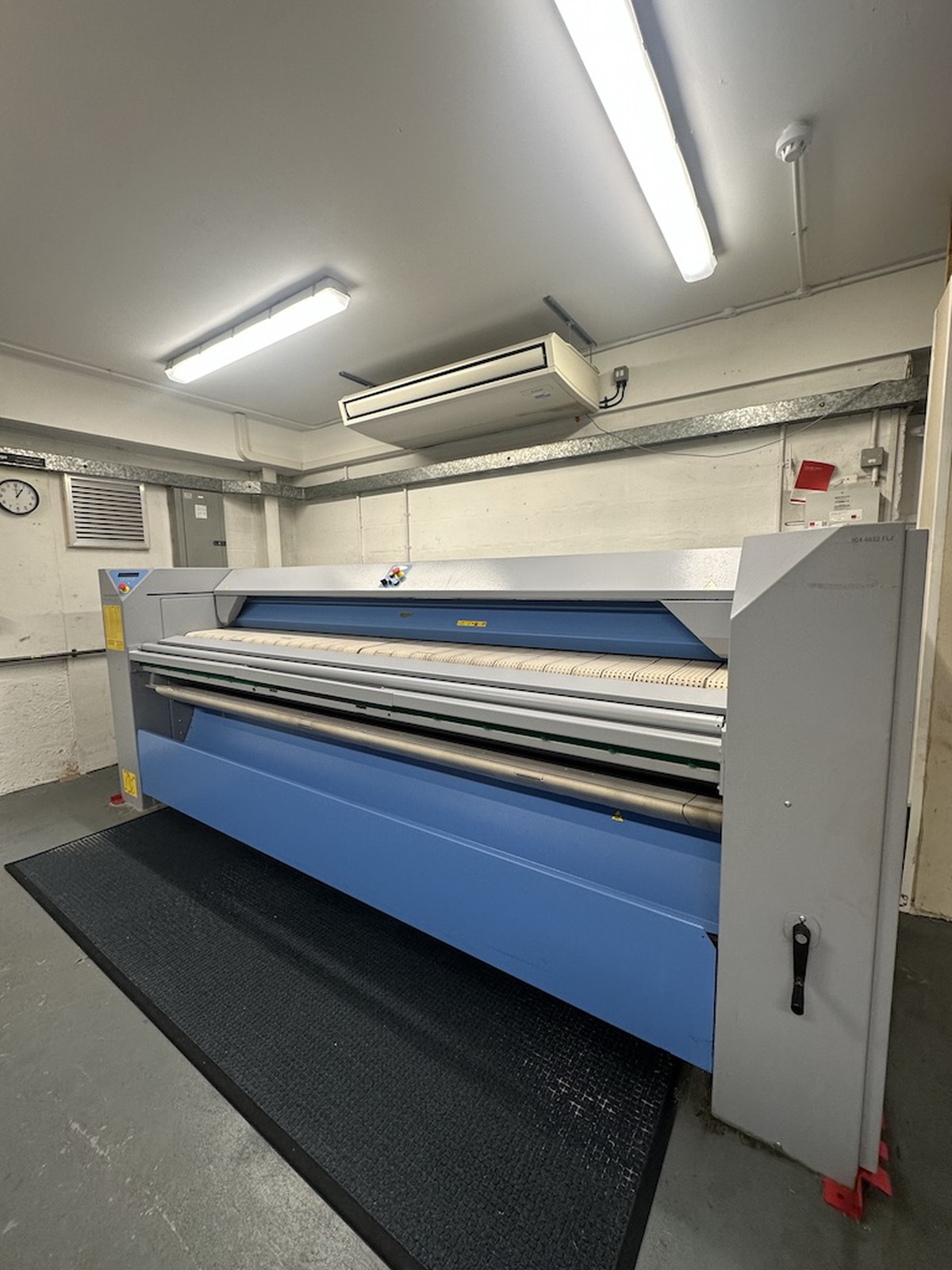 This machine can cope with widths up to Super-king across its 3.3m bed. It can be used to process table linen, sheets and duvets and even small pieces if the feeder element is unused.